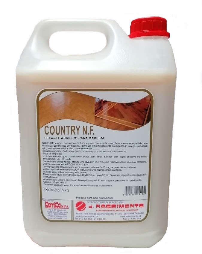 COUNTRY é uma emulsão à base de água de polímeros acrílicos e uretanos formulada como selante de pisos de madeira. O produto é inodoro, de secagem rápida e muito fácil de aplicar. A película COUNTRY é brilhante e resistente a arranhões e marcas de trânsito. Apresenta boa resistência a manchas e absorção de água.