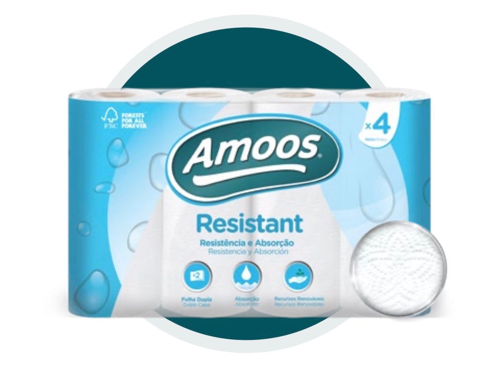 O Amoos Resistant são os rolos de cozinha com a capacidade de absorção e poder de resistência. Produzidos com folha dupla e 100% celulose, este produto é ideal para a limpeza de superfícies húmidas garantindo a robustez do papel sem reduzir o poder de absorção. Proveniente de recursos renováveis, Amoos Resistant é também apto para contacto alimentar.